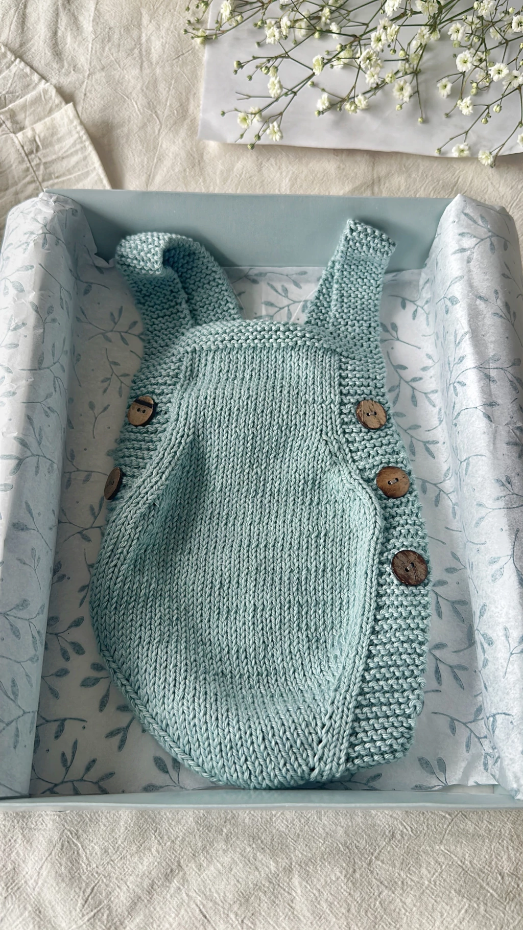Jardinero o peto tejido a mano. Cierre lateral con tres botones. Se recomienda su uso para temporada de otoño y primavera.