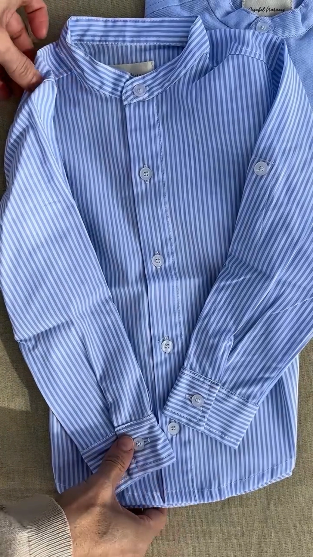 Su diseño cuenta con un cuello mao y un abotonado en el frente, brindando un toque sofisticado y moderno. Además, incluye boton en la manga para poder usarla con las mangas arremangadas. Su estampado de finas rayas en blanco y azulino es versátil y se puede combinar fácilmente con una bermuda y saquito para completar el look.